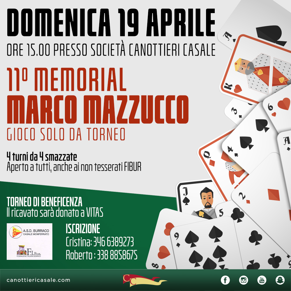 Domenica 19 aprile, a partire dalle ore 15, presso la Società Canottieri Casale, si terrà l’11ª edizione del Memorial Marco Mazzucco, tradizionale appuntamento dedicato al gioco del burraco e al ricordo di Marco. Il torneo si svolgerà con formula articolata in 4 turni da 4 smazzate, ed è aperto a tutti, compresi i non tesserati FIBUR.
